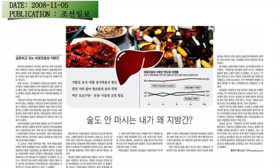 대한간학회의 제9회 간의 날 테마인 비알코올성 지방간을 효과적으로 홍보하기 위해 조선일보의 헬스면에도 기획기사를 전면에 걸쳐 실을 수 있었습니다. 특히, 10년간 간질환 데이터를 분석한 결과 중심으로 유의미하게 메시지가 잘 실렸습니다.