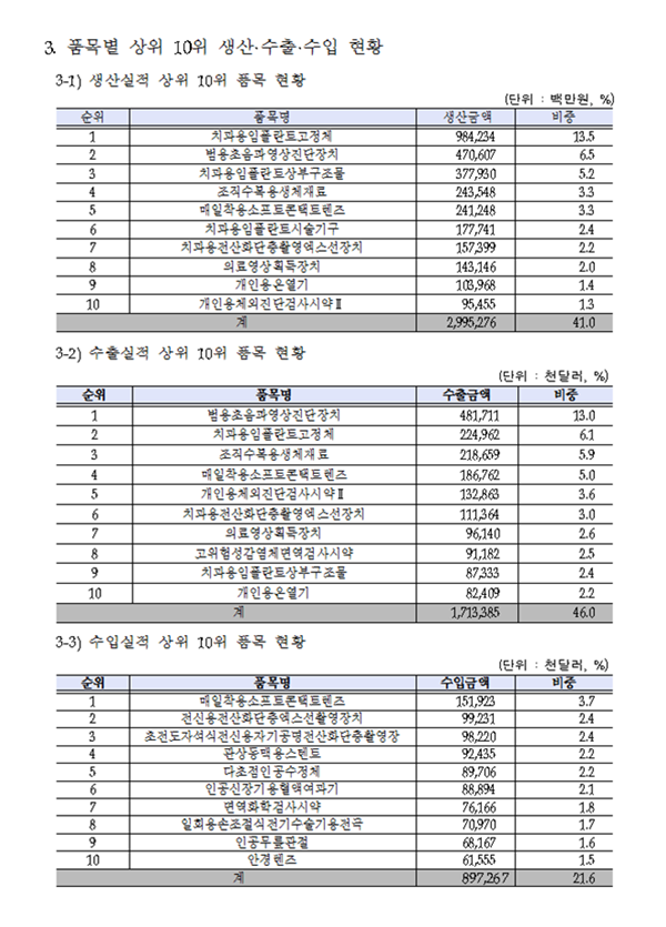의료기기 생산 품목을 살펴보면 치과용임플란트가 1조3621억으로 3년 연속 부동의 1위를 지켰다. 식약처는 이를 "인구 고령화와 건강보험 적용 확대에 따른 것으로 분석된다"고 설명했다. 이어 범용초음파영상진단장치 4706억, 성형용 필러 2435억 순으로, 생산 상위 10개 품목이 전체의 41.1%(2조 9953억)를 차지했다. 또한 전년대비 생산액 증가율이 가장 높은 품목은 치과용전산화단층촬영장치와 치과용임플란트로 각각 75.3% 26.9%의 증가율을 보였다.