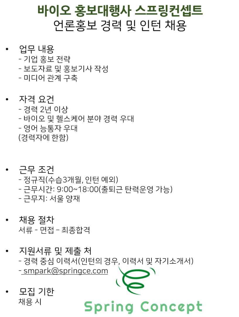 바이오 홍보대행사 스프링컨셉트, 언론홍보 경력 및 인턴 채용