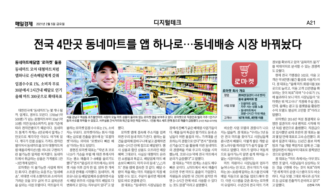 스프링컨셉트의 고객사인 동네마트 장보기앱 로마켓의 기사가 매일경제 디지털테크면 Top에 기사화 되었습니다.