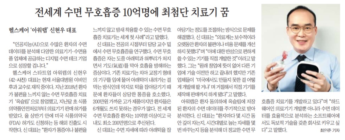 스프링컨셉트의 고객사인 슬립테크 AI기업 아워랩 신현우 대표님이 조선일보 지면에 소개되었습니다.